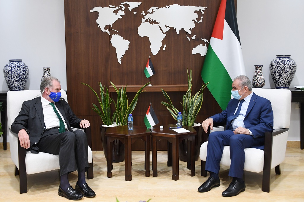 رام الله 21-10-2021 وفا- بحث رئيس الوزراء محمد اشتية، اليوم الخميس، مع القنصل الإسباني الجديد ألفونسو ماتيو، آخر المستجدات السياسية، وتعزيز التعاون المشترك، خلال استقباله للقنصل في مكتبه برام الله.