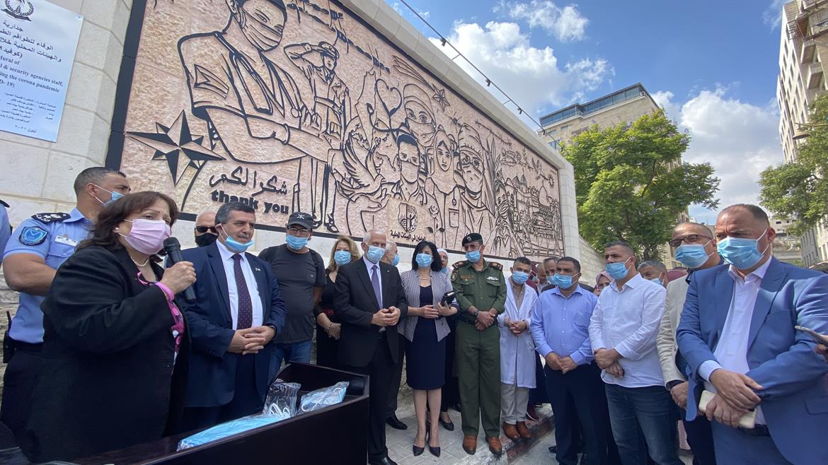 بيت لحم 3-10-2021 وفا- دشنت وزيرة الصحة مي الكيلة، اليوم الأحد، جدارية "الوفاء للطواقم الطبية والأمنية والهيئات المحلية" خلال جائحة "كورونا"، في بيت لحم.