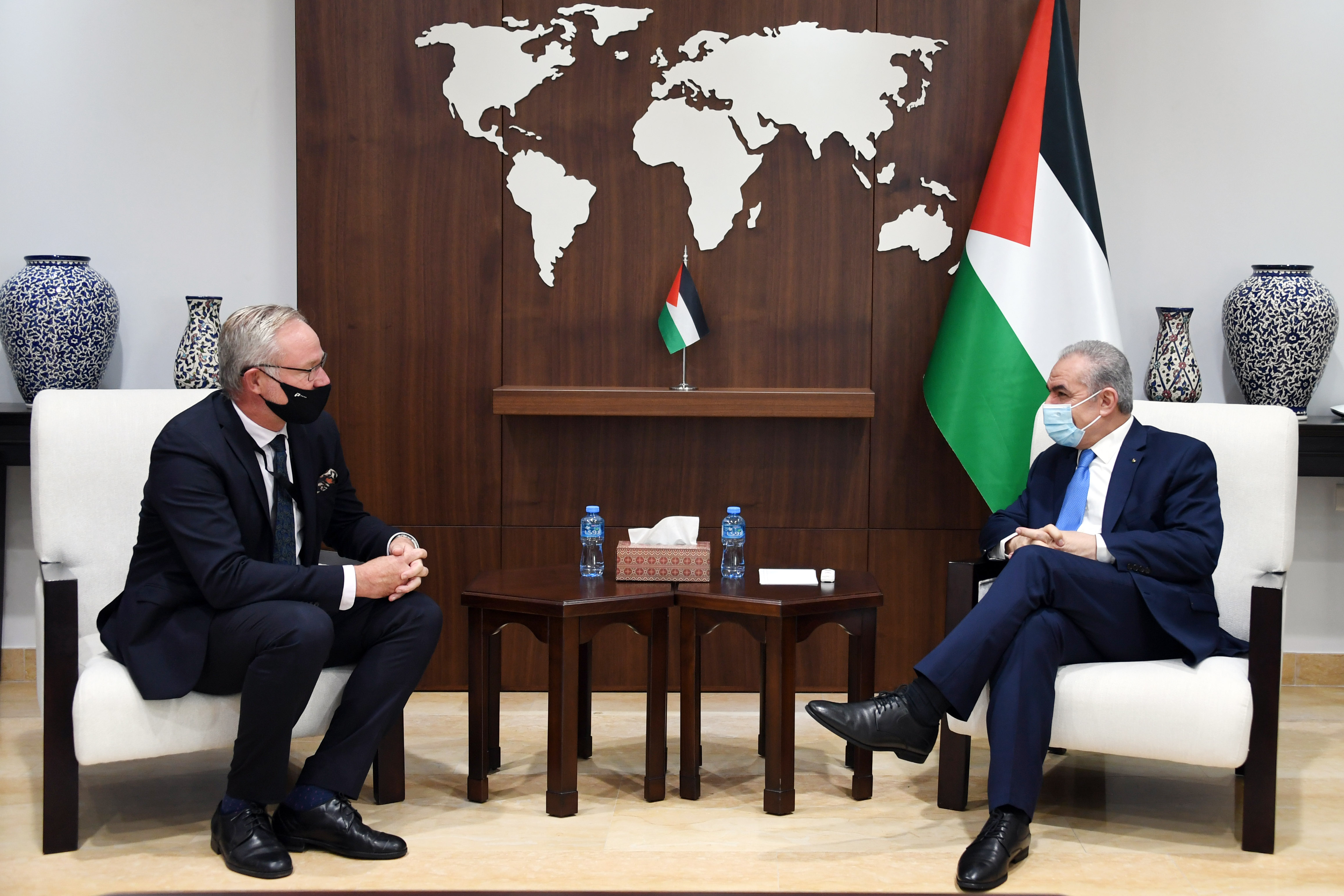 رام الله 7-10-2021 وفا- بحث رئيس الوزراء محمد اشتية، اليوم الخميس، في مكتبه برام الله، مع القنصل السويدي العام الجديد يوليوس ليليستروم آخر التطورات السياسية والاقتصادية.