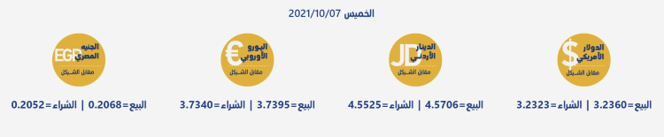 رام الله 7-10-2021 وفا- جاءت أسعار العملات مقابل الشيقل الإسرائيلي، اليوم الخميس، حسب سلطة النقد، على النحو التالي: