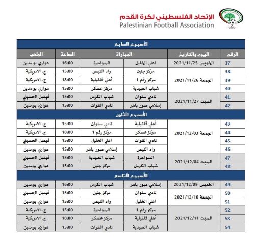 القدس 21-11-2021 وفا- أعلن الاتحاد الفلسطيني لكرة القدم، اليوم الأحد، عن جدول مباريات الأسابيع السابع والثامن والتاسع من دوري الاحتراف الجزئي، على النحو الآتي: