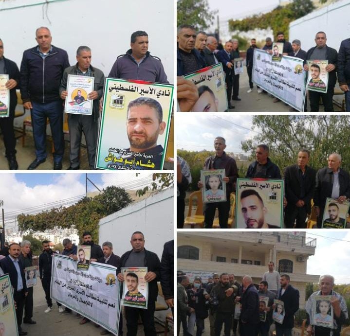 الخليل 22-11-2021 وفا- شارك ذوو الأسرى وفعاليات الخليل، اليوم الاثنين، في وقفة دعم واسناد للأسرى المضربين عن الطعام رفضا لسياسة الاعتقال الإداري، نظمتها المؤسسات التي تعنى بالأسرى، بالشراكة مع هيئة التنسيق الوطني ولجان أهالي الأسرى بالمحافظة، أمام مقر اللجنة الدولية للصليب الأحمر وسط المدينة.