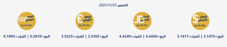 رام الله 25-11-2021 وفا- جاءت أسعار العملات مقابل الشيقل الإسرائيلي، اليوم الخميس، حسب سلطة النقد، على النحو التالي: