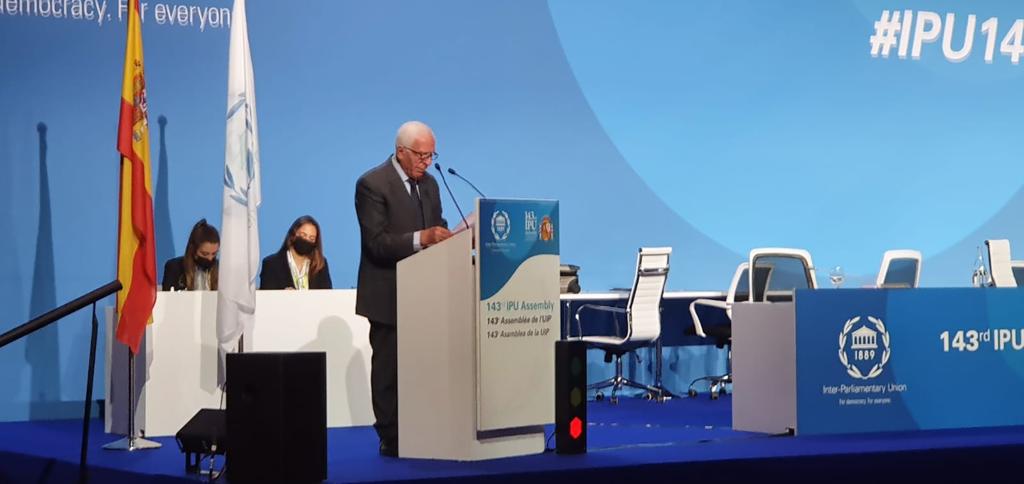 مدريد 28-11-2021 وفا- قال رئيس وفد المجلس الوطني الفلسطيني للدورة الـ143 للاتحاد البرلماني الدولي، عضو اللجنة المركزية لحركة "فتح" عزام الأحمد، إن شعبنا لم يعد يحتمل تجاهل تنفيذ قرارات الشرعية الدولية التي تنهي الاحتلال وتمكّنه من تقرير مصيره وعودته إلى أرضه والعيش حرا في دولته المستقلة وعاصمتها القدس.