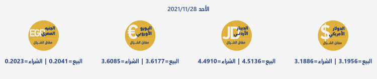 رام الله 28-11-2021 وفا- جاءت أسعار العملات مقابل الشيقل الإسرائيلي، اليوم الأحد، حسب سلطة النقد، على النحو التالي:
