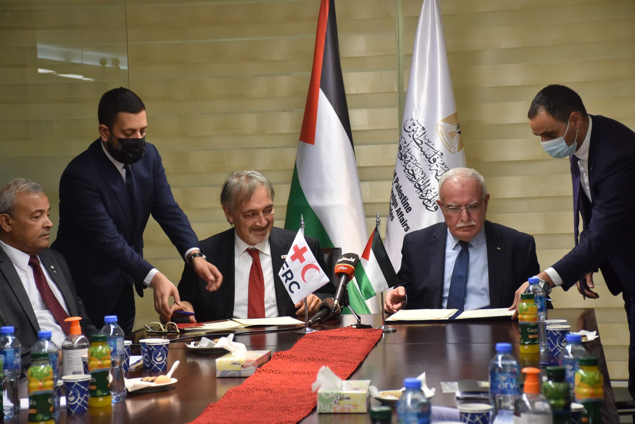 رام الله 9-11-2021 وفا- وقع وزير الخارجية والمغتربين رياض المالكي مع رئيس الاتحاد الدولي لجمعيات الصليب الأحمر والهلال الأ حمر فرانشيسكو روكا، اتفاقية لفتح مكتب للاتحاد لدى دولة فلسطين.