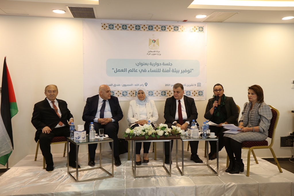 رام الله 9-11-2021 وفا- دعا مشاركون في جلسة حوارية عقدتها وزارة شؤون المرأة في رام الله، اليوم الثلاثاء، إلى توفير بيئة آمنة للنساء وتشكيل لجنة حماية لهن في عالم العمل.