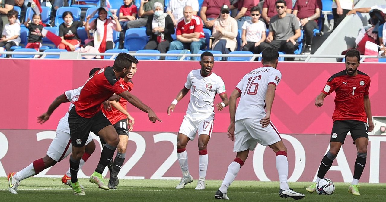 وكان اللقاء ضعيفا في أغلب أوقاته من المنتخبين، وكانت البداية لصالح منتخب قطر دون ان يكون هناك أي خطورة أو محاولات حقيقية على مرمى الحارس محمد الشناوي، وبعدها ظهر المنتخب المصري وبسط سيطرته على مجريات الشوط الأول لكن ذلك لم يمنحه التسجيل لينتهي الشوط بالتعادل السلبي.