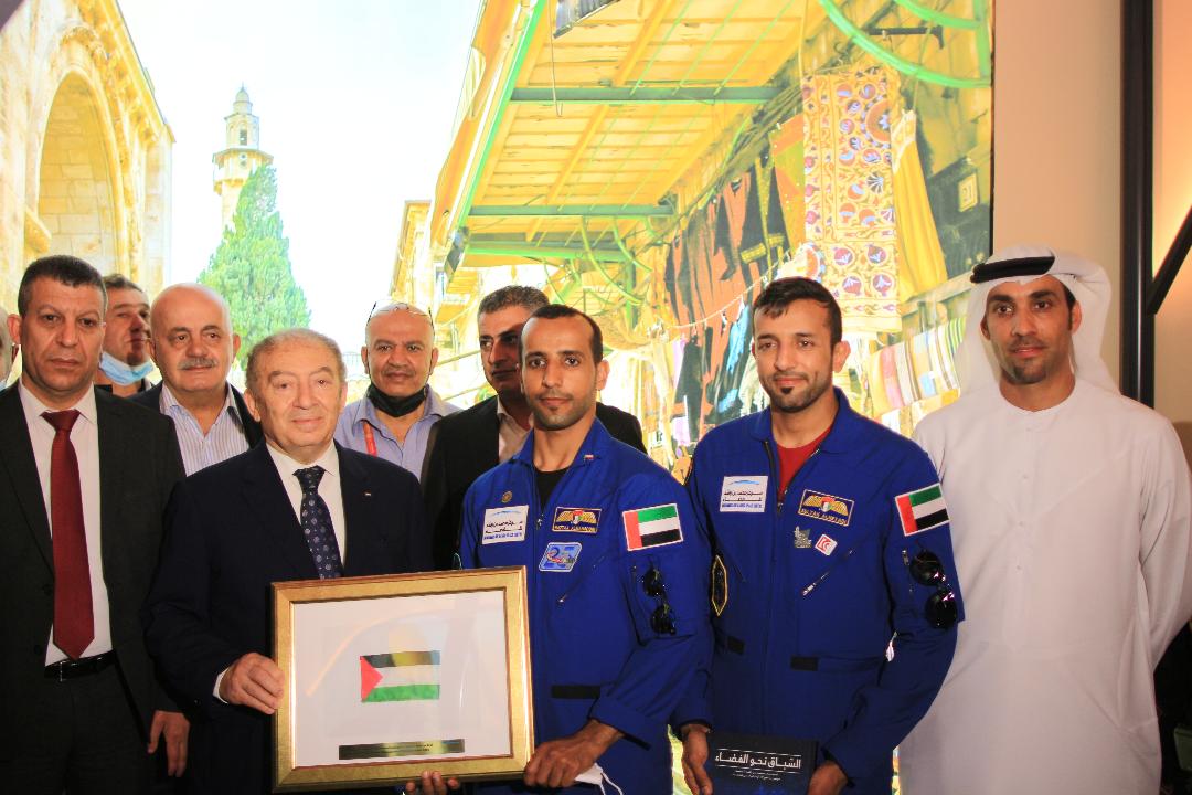 وقال المنصوري "إن زيارتي لجناح دولة فلسطين محط فخر واعتزاز للإمارات قيادة وشعبا، واليوم تكتمل فرحتنا بإهداء العلم الفلسطيني الذي حملته قبل عامين لمحطة الفضاء الدولية، إلى الشعب الفلسطيني".