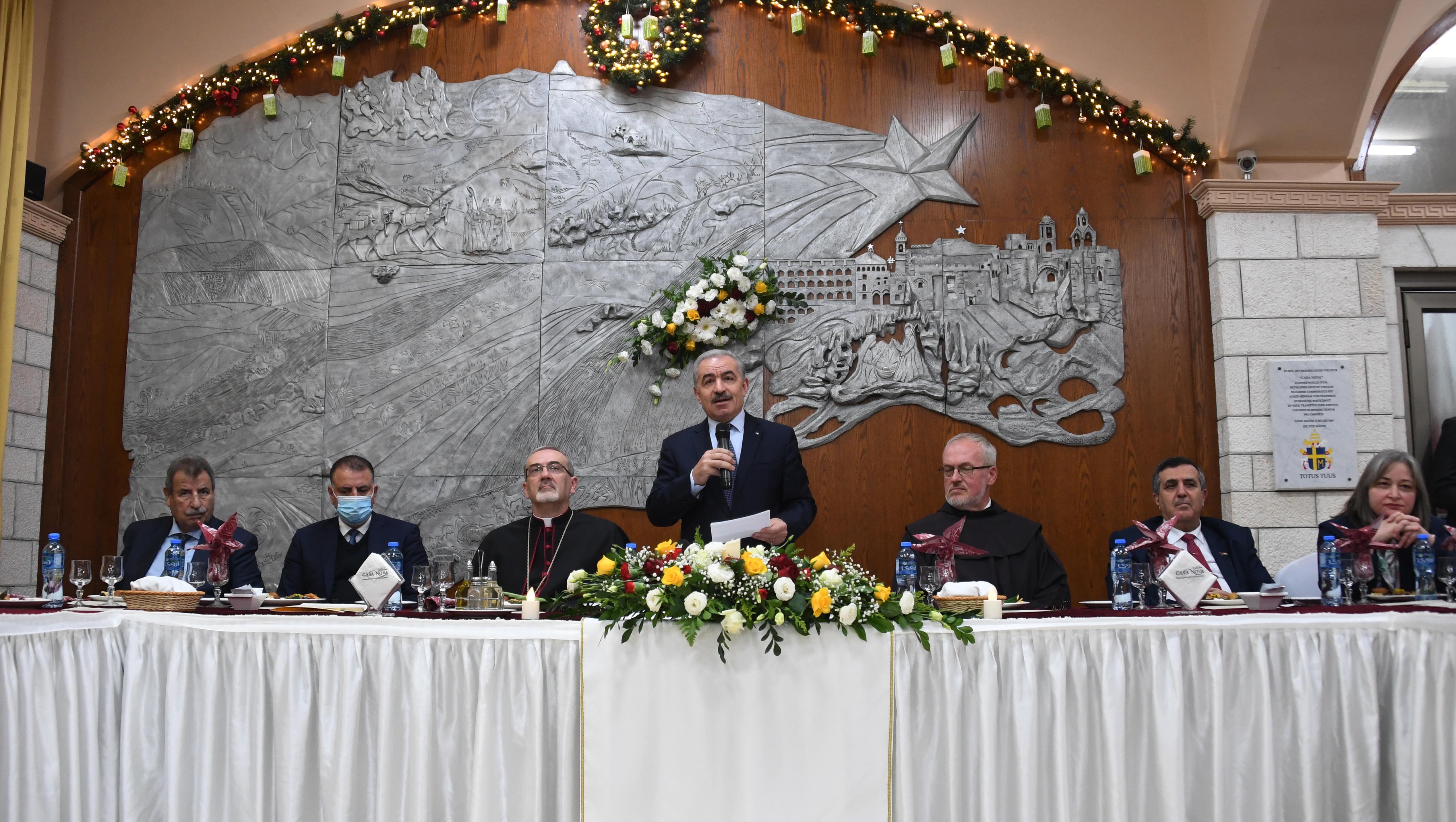 جاء ذلك خلال كلمته نيابة عن رئيس دولة فلسطين محمود عباس، في عشاء الميلاد، مساء اليوم الجمعة، في دير الفرنسيسكان بمدينة بيت لحم، للكنائس المسيحية التي تسير حسب التقويم الغربي، بحضور بطريرك القدس للاتين بيير باتيستا بيتسابالا، ونائب حارس الأراضي المقدسة الأب دوبرومير جاستيل، وممثل الملك عبد الله الثاني، وزير الداخلية الأردني مازن الفراية، ورئيس اللجنة الرئاسية العليا لمتابعة شؤون الكنائس رمزي خوري، ومحافظ بيت لحم كامل حميد، وعدد من الشخصيات الرسمية والاعتبارية والدينية والسلك الدبلوماسي.