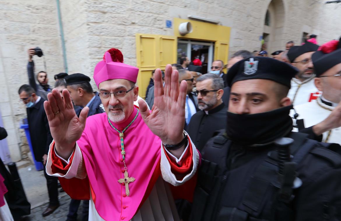 واستقبل البطريرك بيتسابالا الذي رافقه لفيف من المطارنة والأساقفة وكبار رجال البطريركية ووجهاء الرعية على بلاطة ساحة المهد من قبل المستقبلين حسب الستاتيكو المتبع، تقدمهم محافظ بيت لحم كامل حميد، ورئيس اللجنة الرئاسية لمتابعة شؤون الكنائس رمزي خوري، ورئيس بلدية بيت لحم أنطون سلمان، ووزيرة السياحة والآثار رولا معايعة، وقائد منطقة بيت لحم العميد ناضر أبو عمر، ومدير عام شرطة المحافظة العميد طارق الحاج، ورؤساء الأجهزة ووجهاء أبناء الرعية اللاتينية وكهنة الآباء الفرنسيسكان والبطريركية الأكليرية اللاتينية من بيت جالا والراهبات.