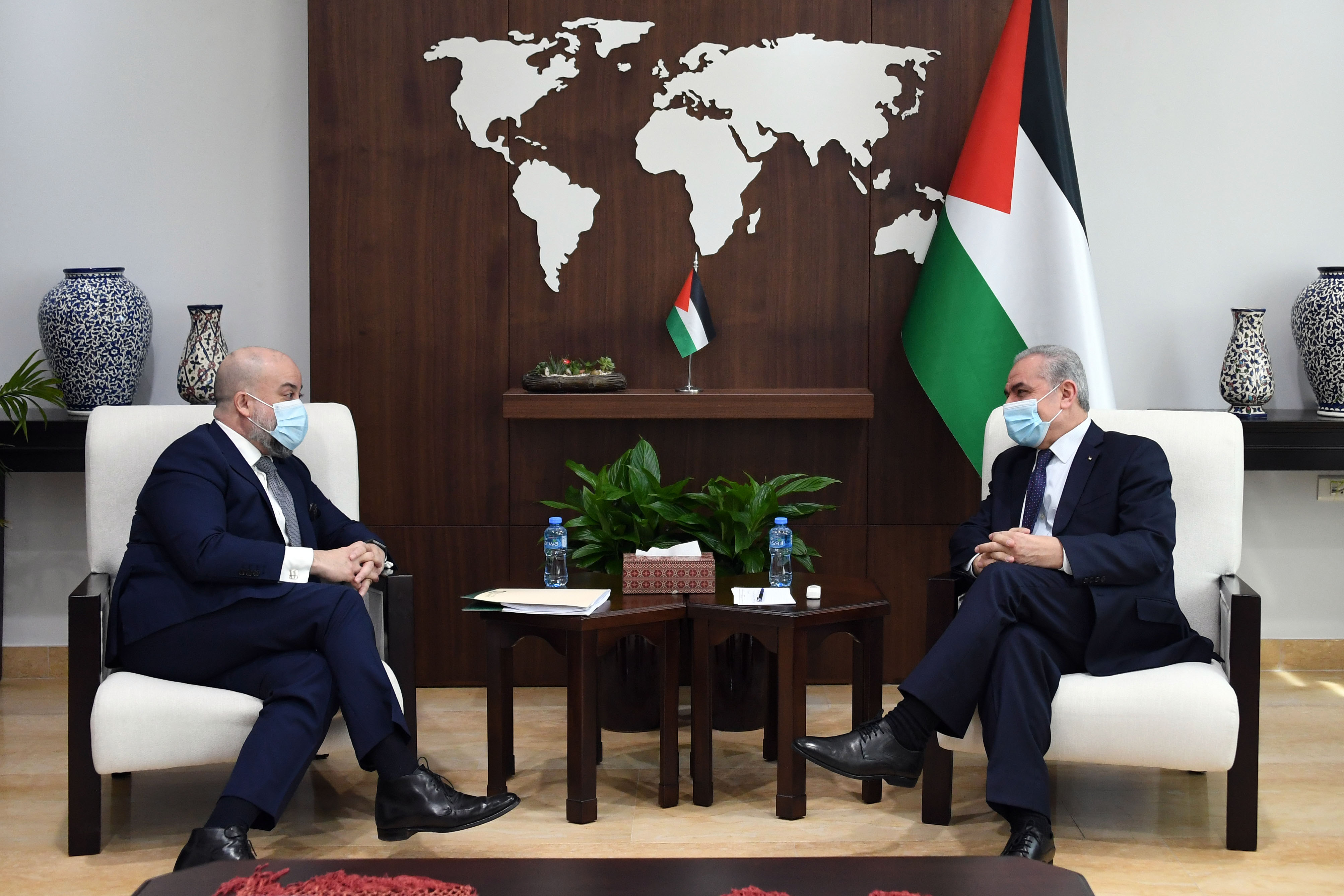 واستعرض اشتية تطورات الاتصالات مع الإدارة الاميركية الجديدة، واستعادة العلاقات، خاصة فيما يتعلق بإعادة فتح مكتب منظمة التحرير في واشنطن، والقنصلية الأميركية العامة في القدس كأولوية سياسية، ودعم مدينة القدس ومستشفياتها، إضافة إلى إعادة الدعم للأونروا.