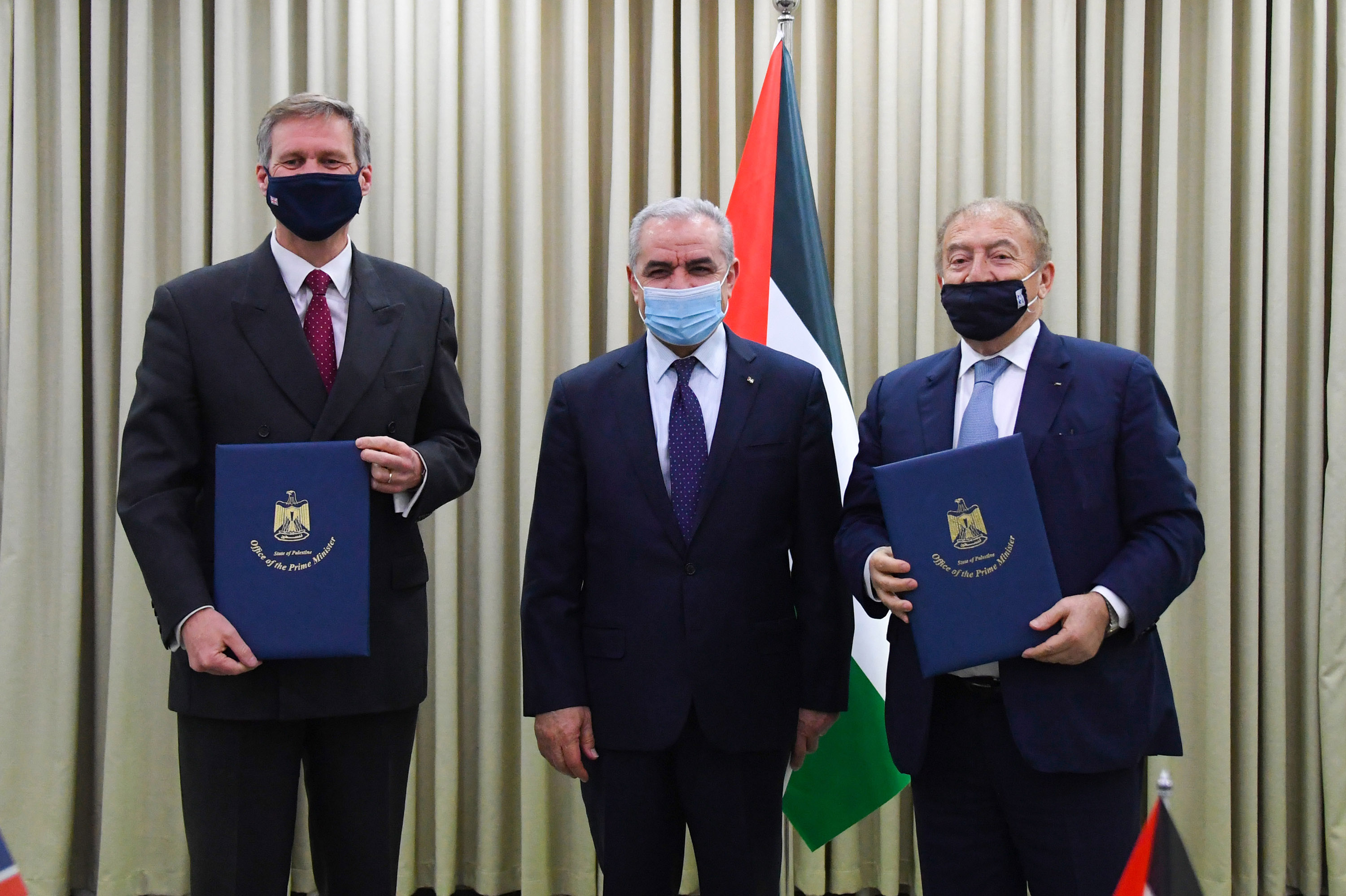 رام الله 16-2-2021 وفا- برعاية وحضور رئيس الوزراء محمد اشتية، وقعت الحكومة ممثلة بوزير الاقتصاد الوطني خالد العسيلي، والحكومة البريطانية ممثلة بالقنصل البريطاني فيليب هول، اليوم الثلاثاء، في مكتب رئيس الوزراء، اتفاقية تعاون لدعم الجهود الفلسطينية في دعم التجارة وتعزيز دور القطاع الخاص، والقدرة التنافسية للمنتجات الوطنية في الاسواق الدولية.