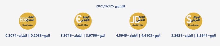 رام الله 25-2-2021 وفا- جاءت أسعار العملات مقابل الشيقل الإسرائيلي، اليوم الخميس، حسب سلطة النقد، على النحو التالي: