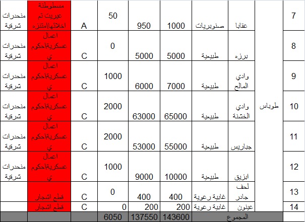 غالبية تلك الأشجار المدمرة جرت في محمية عينون شرق طوباس، حيث دمر الاحتلال عشرة آلاف شجرة حرجية تتراوح أعمارها بين 1-7 أعوام، وثلاثمئة شجرة زيتون، على مساحة تقدر بمئتي دونم، وفق ما توضح وزارة الزراعة.