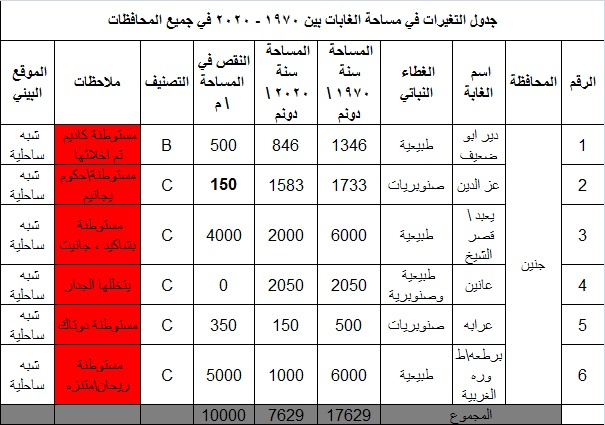 ويظهر الجدول التالي التغيرات في مساحة الغابات بين 1970 - 2020 في جميع محافظات الوطن: