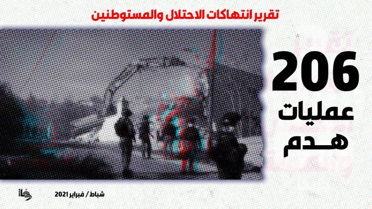 نفذت قوات الاحتلال الإسرائيلي خلال الشهر الماضي 206 عمليات هدم، شملت منازل ومساكن ومنشآت وخيام وجدران استنادية.