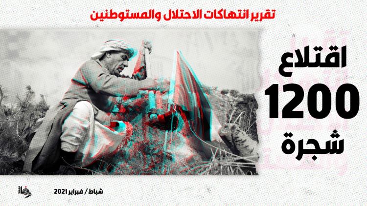 أقدم الاحتلال والمستوطنون خلال الشهر الماضي، على اقتلاع 1200 شجرة زيتون وحرجية وأشتال، ورش معظمها بمواد سامة في مناطق الخليل وبيت لحم وعينون في طوباس.