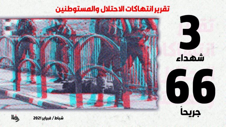 رام الله 1-3-2021 وفا- رصدت وكالة الأنباء والمعلومات الفلسطينية "وفا"، في تقريرها الثاني، حول الانتهاكات التي ارتكبتها قوات الاحتلال الإسرائيلي والمستوطنون، بحق أبناء شعبنا وأرضهم وممتلكاتهم ومقدساتهم، ارتقاء ثلاثة شهداء اثنان منهم دعسا بمركبات المستوطنين وآخر برصاصهم، وإصابة 66 آخرين بجروح مختلفة، واعتقال 317 مواطنا.