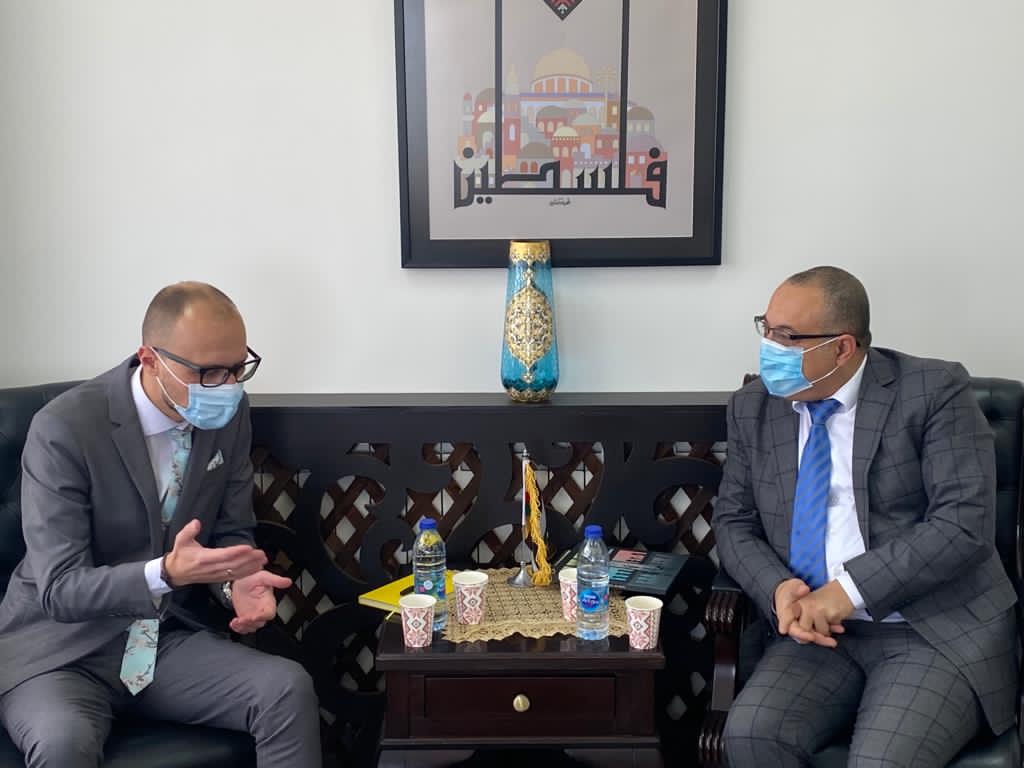 رام الله 18-3-2021 وفا- بحث وزير الثقافة عاطف أبو سيف مع رئيس مكتب تمثيل جمهورية لتوانيا بيرتاس فينيسكايتيس آفاق التعاون الثقافي بين البلدين.