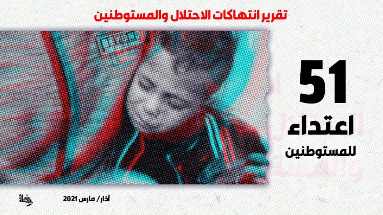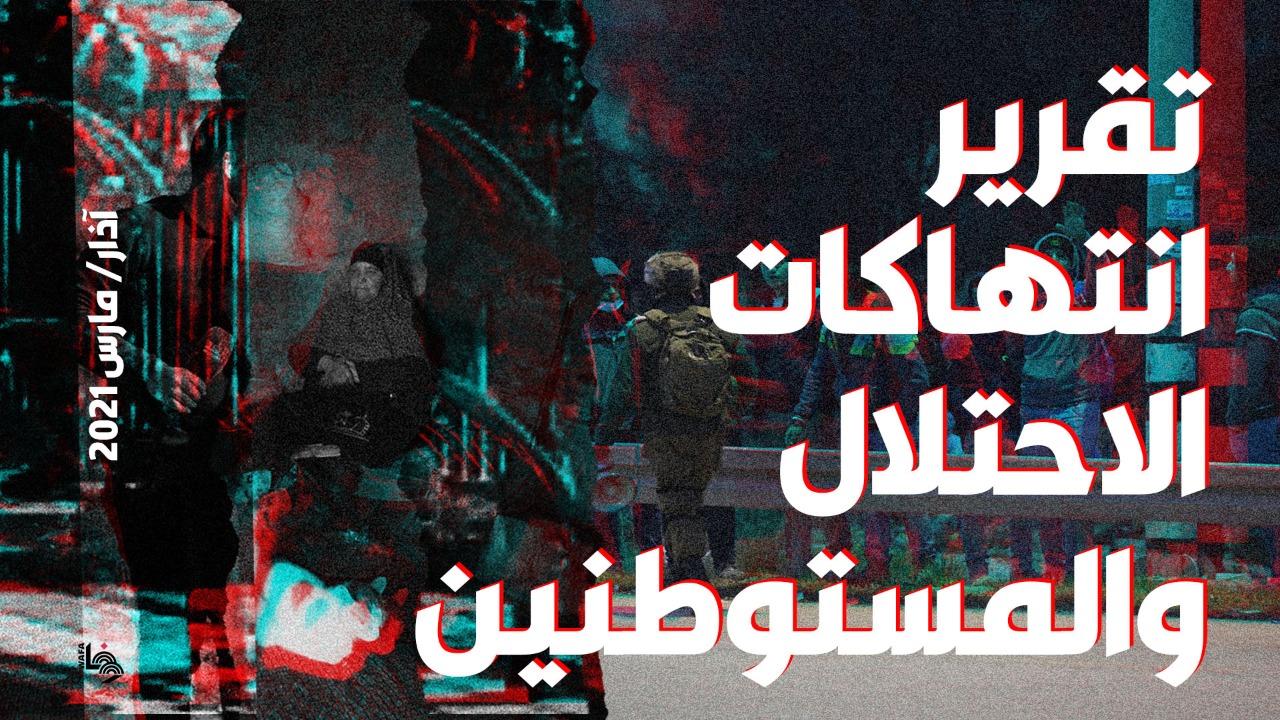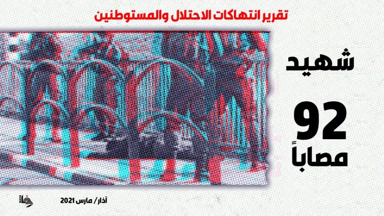 رام الله 1-4-2021 وفا- رصدت وكالة الأنباء والمعلومات الفلسطينية "وفا"، في تقريرها الثالث، حول الانتهاكات التي ارتكبتها قوات الاحتلال الإسرائيلي والمستوطنون، بحق أبناء شعبنا وأرضهم وممتلكاتهم ومقدساتهم، الذي يغطي شهر آذار المنصرم، ارتقاء شهيد، وإصابة 92 آخرين بجروح مختلفة بينهم 3 أطفال و8 سيدات، واعتقال 298 مواطنا، بينهم 6 سيدات، و10 أطفال.
