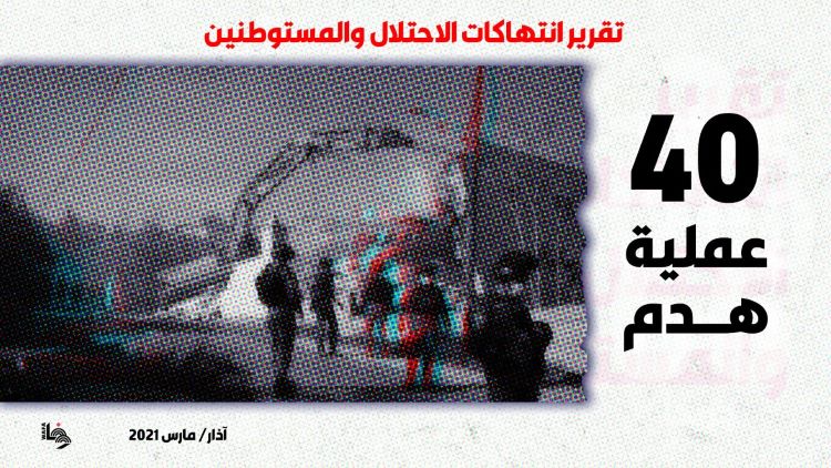 نفذت قوات الاحتلال الإسرائيلي خلال الشهر الماضي 40 عملية هدم، شملت منازل ومساكن ومنشآت وخيام وجدران استنادية.
