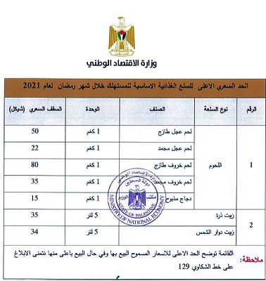 رام الله 15-4-2021 وفا- أعلنت وزارة الاقتصاد الوطني، اليوم الخميس، عن تحديد السقف السعري الأعلى للمستهلك لسلعتي اللحوم (لحم العجل الطازج والمجمد، ولحم الخروف الطازج، والدجاج) إضافة إلى سلعة زيت الذرة ودوار الشمس.