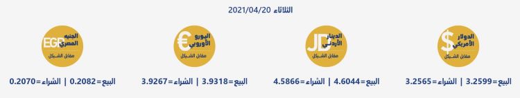 رام الله 20-4-2021 وفا- جاءت أسعار العملات مقابل الشيقل الإسرائيلي، اليوم الثلاثاء، حسب سلطة النقد، على النحو التالي: