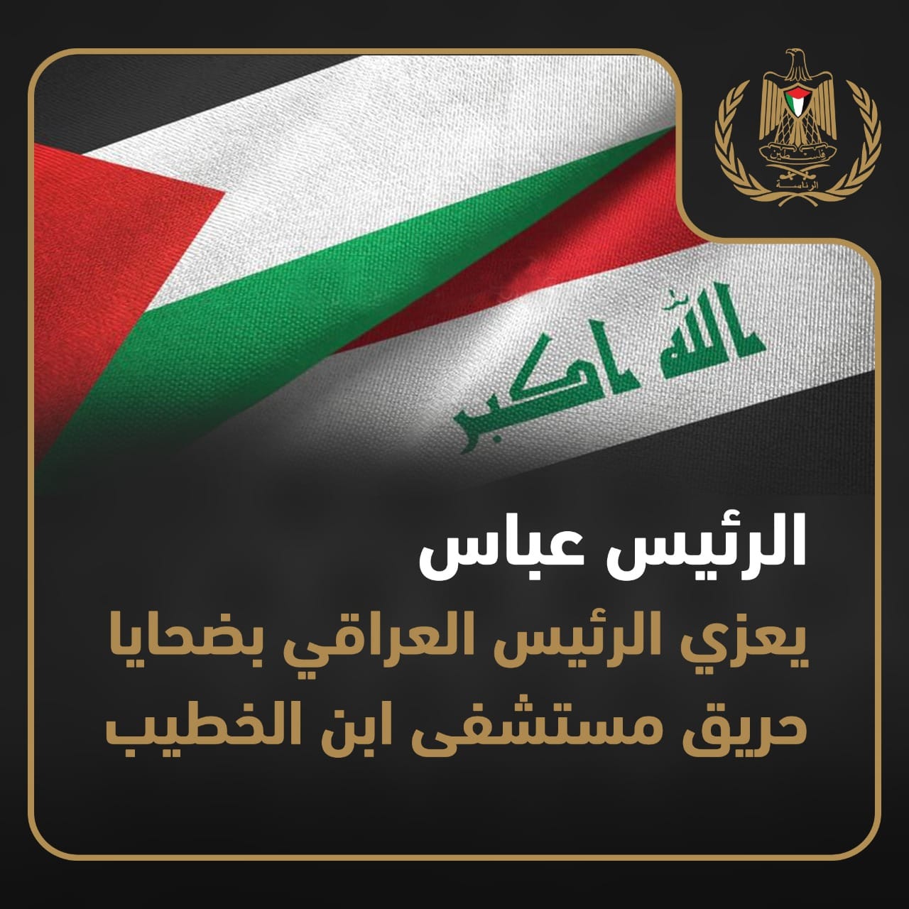 رام الله 25-4-2021 وفا- عزى رئيس دولة فلسطين محمود عباس، الرئيس العراقي برهم صالح، بضحايا الحريق الذي نشب في مستشفى ابن الخطيب في العاصمة، بغداد، والذي أدى لوقوع عشرات الضحايا والمصابين.