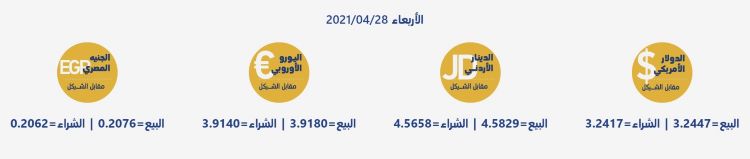 رام الله 28-4-2021 وفا- جاءت أسعار العملات مقابل الشيقل الإسرائيلي، اليوم الأربعاء، حسب سلطة النقد، على النحو التالي: