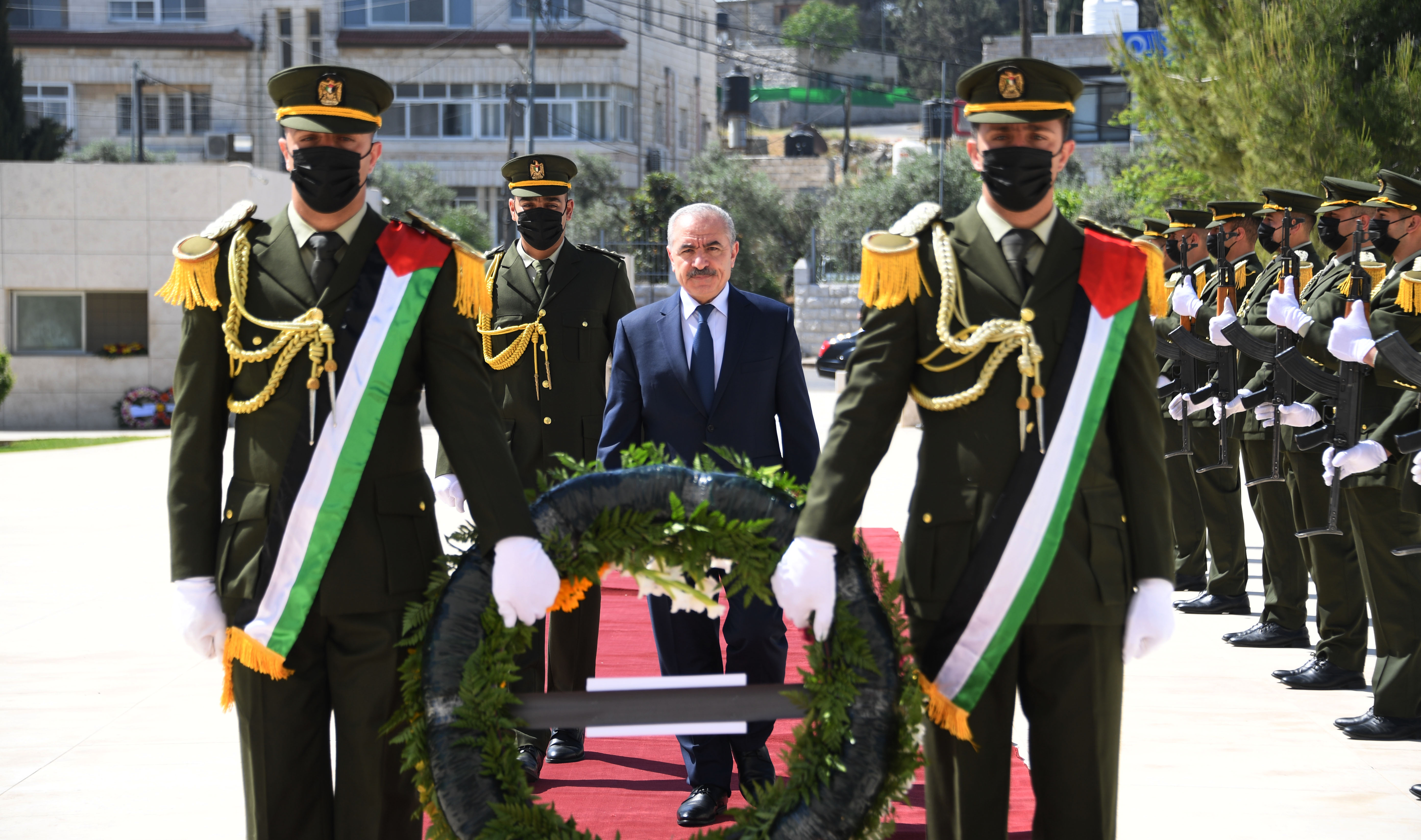 رام الله 13-5-2021 وفا- نيابة عن رئيس دولة فلسطين محمود عباس، وضع رئيس الوزراء محمد اشتية، اليوم الخميس، إكليلا من الزهور على ضريح الرئيس الشهيد ياسر عرفات، بمقر الرئاسة بمدينة برام الله، بمناسبة عيد الفطر السعيد.
