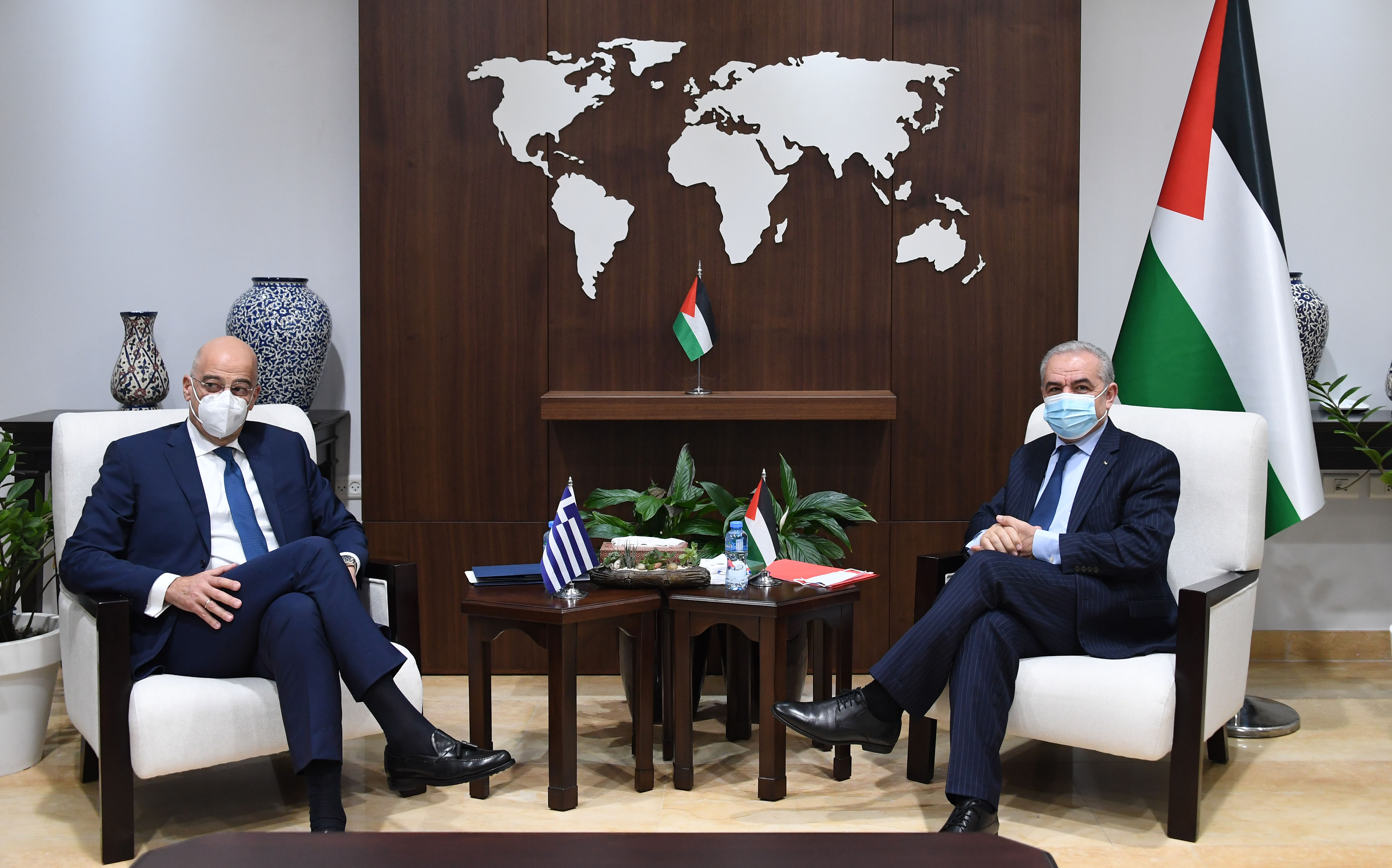 جاء ذلك خلال استقباله اليوم الثلاثاء في مكتبه بمدينة رام الله، الوزير ديندياس بحضور سفير اليونان لدى فلسطين ايفانجيلوس فليوراس.