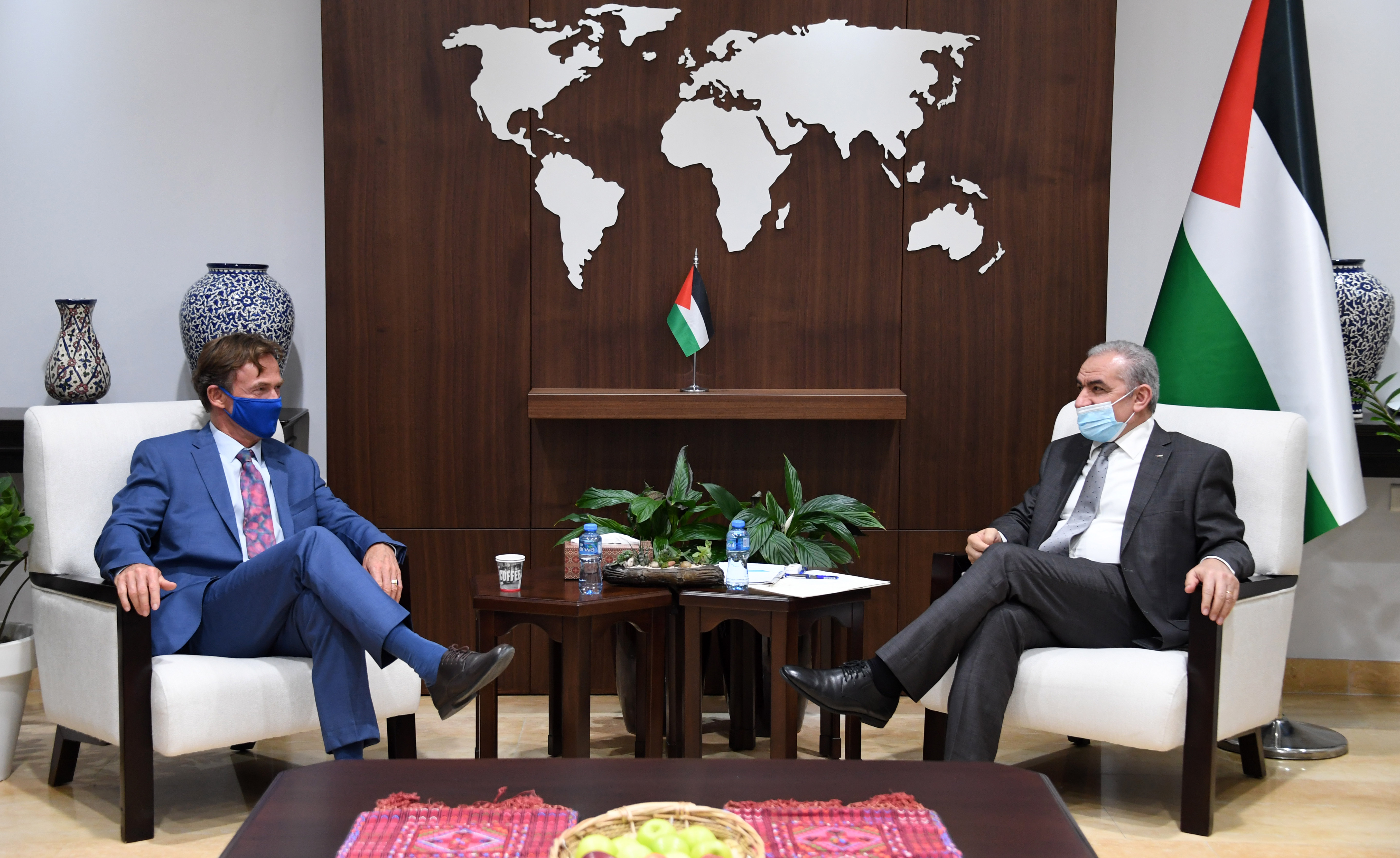 رام الله 19-5-2021 وفا- استقبل رئيس الوزراء محمد اشتية، اليوم الأربعاء، في مكتبه برام الله، ممثل الاتحاد الأوروبي لدى فلسطين سفن كون بورغسدورف، لبحث مساعي وقف العدوان الإسرائيلي على قطاع غزة، ووقف انتهاكات قوات الاحتلال في القدس والضفة الغربية، والاطلاع على جهود الاتحاد الأوروبي والاتصالات التي يجريها مع جميع الأطراف للوصول إلى وقف العدوان.
