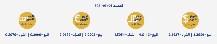 رام الله 6-5-2021 وفا- جاءت أسعار العملات مقابل الشيقل الإسرائيلي، اليوم الخميس، حسب سلطة النقد، على النحو التالي:
