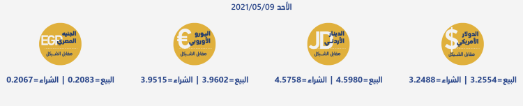 رام الله 9-5-2021 وفا- جاءت أسعار العملات مقابل الشيقل الإسرائيلي، اليوم الأحد، حسب سلطة النقد، على النحو التالي: