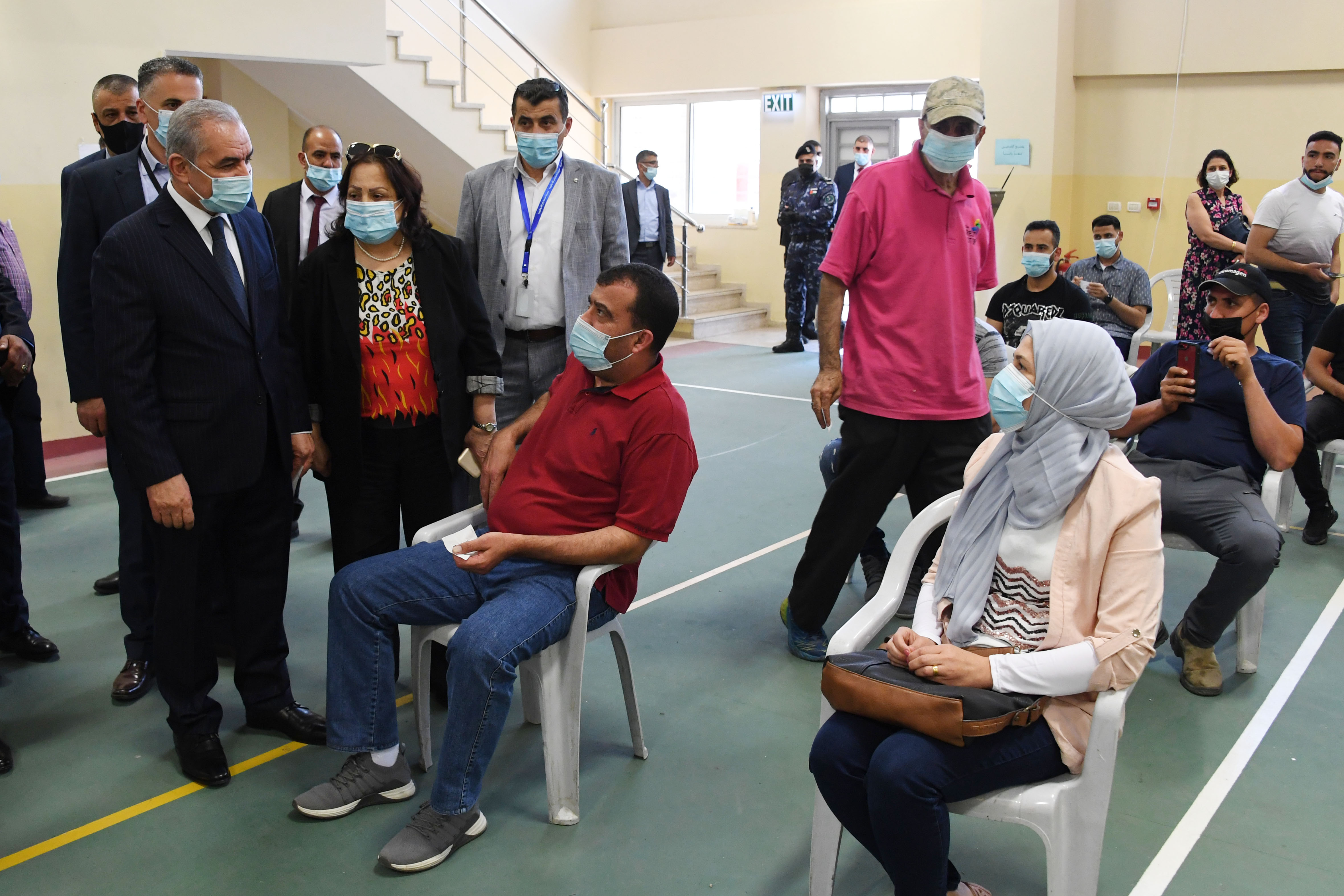 رام الله 13-6-2021 وفا- تفقد رئيس الوزراء محمد اشتية، اليوم الأحد، مركزي التطعيم والفحص الخاصين بـ "كورونا" في رام الله، بحضور وزيرة الصحة مي كيلة وعدد من كوادر الوزارة.