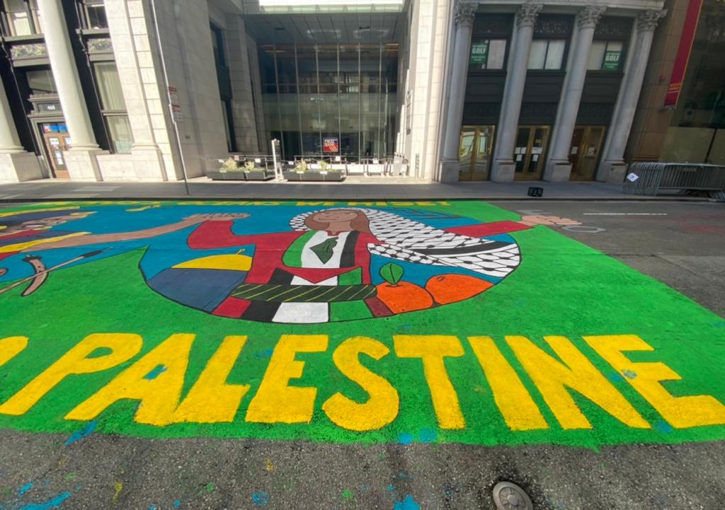 واشنطن 14-6-2021 وفا- خط متضامنون من الجالية الكولومبية لوحة فنية أمام مقر القنصلية الإسرائيلية في مدينة سان فرانسيسكو بولاية كاليفورنيا، تعبيرا عن تضامنهم مع شعبنا، وذلك خلال وقفة نظمت احتجاجا على ممارسات الاحتلال بحق أبناء شعبنا.
