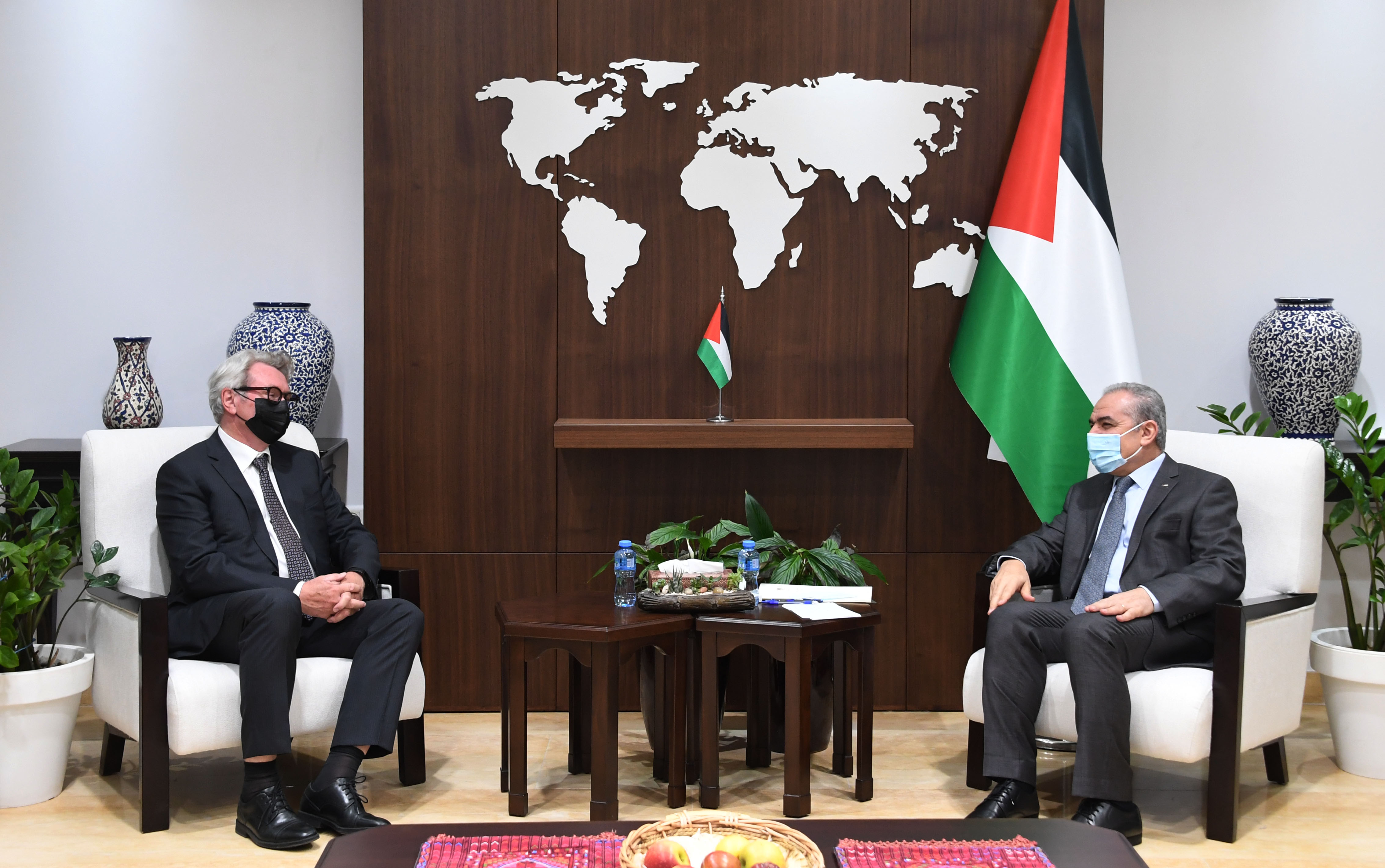 رام الله 15-6-2021 وفا- بحث رئيس الوزراء محمد اشتية مع المبعوث النرويجي لعملية السلام في الشرق الأوسط جون هانسن باور، آخر المستجدات السياسية وإعادة إعمار قطاع غزة.