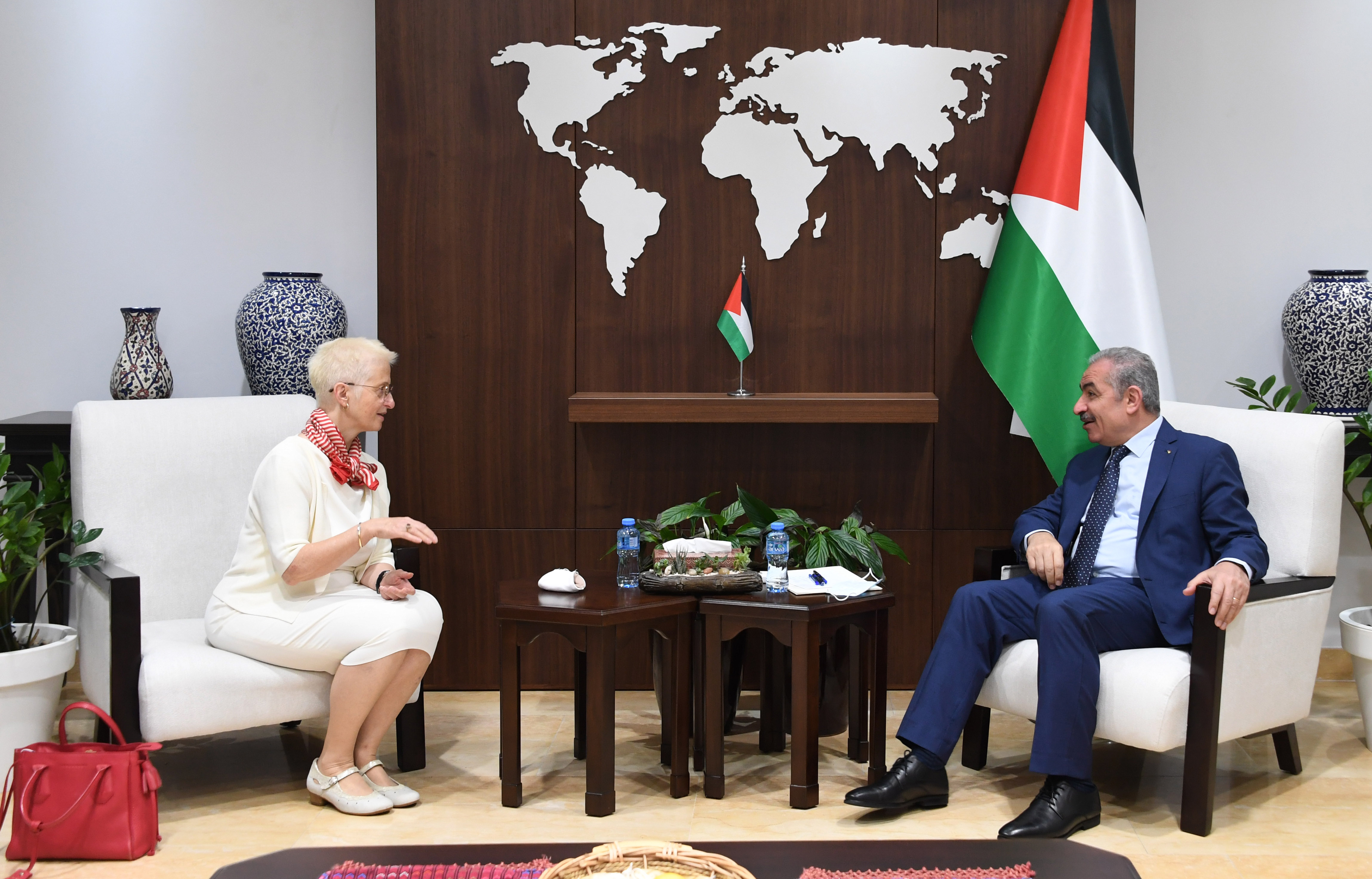 رام الله 17-6-2021 وفا- استقبل رئيس الوزراء محمد اشتية، اليوم الخميس، القنصل البلجيكي العام في القدس دانييل هافين، لمناسبة انتهاء مهامها الرسمية.