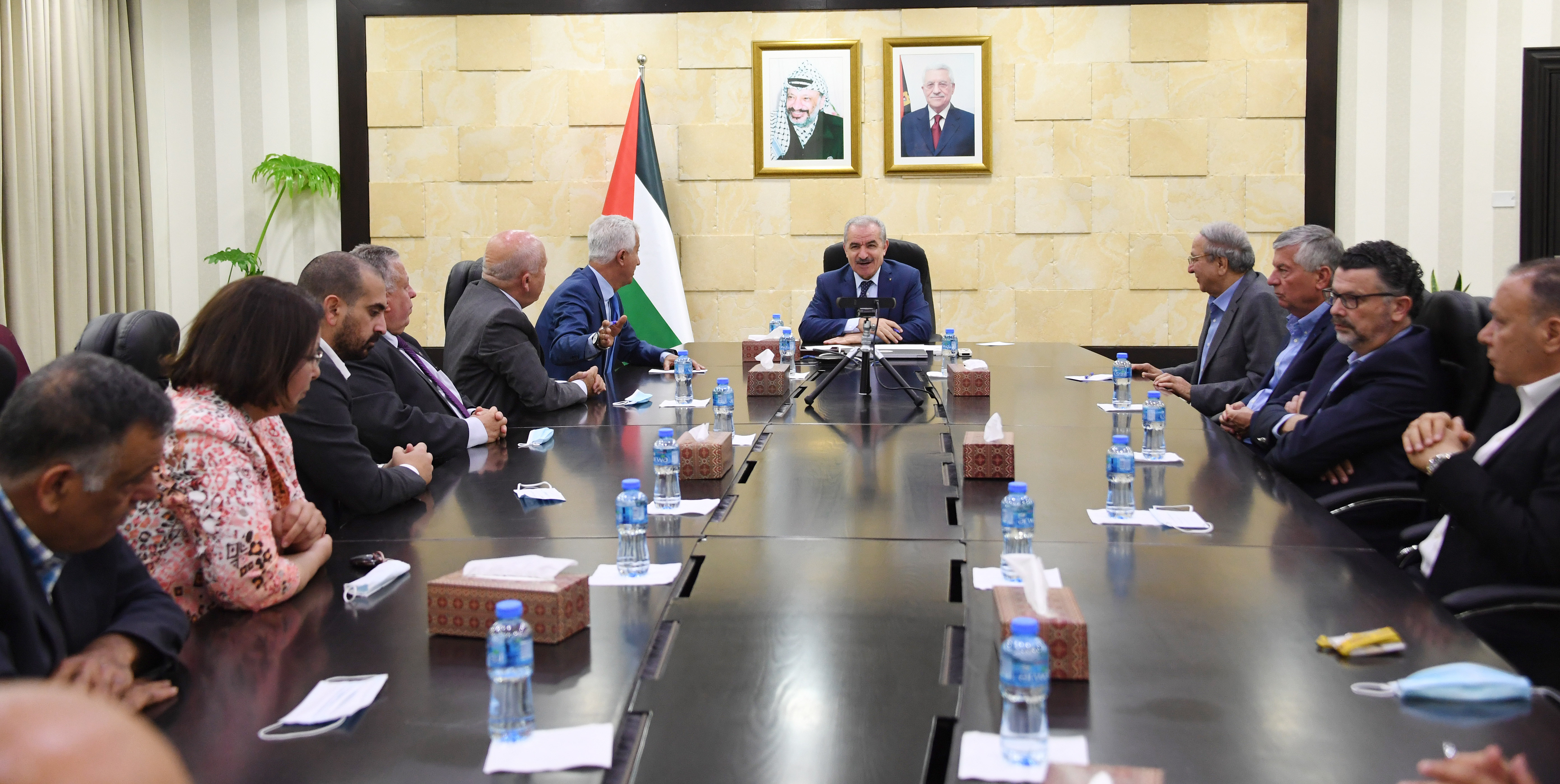 رام الله 17-6-2021 وفا- بحث رئيس الوزراء محمد اشتية مع المجلس التنسيقي للقطاع الخاص، تعزيز الشراكة بين الجانبين، وإنعاش القطاعات الاقتصادية مع بدء التعافي من وباء "كورونا"، وذلك اليوم الخميس في مكتبه بمدينة رام الله.