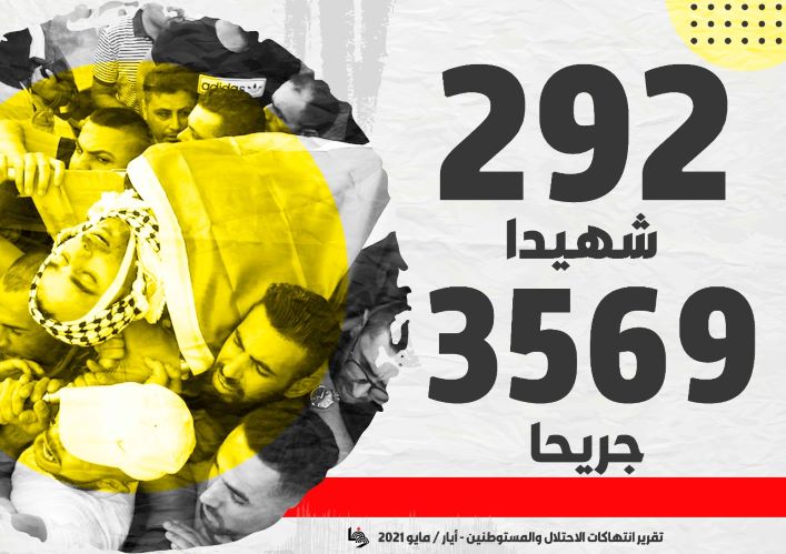 ارتقى خلال شهر أيار/ مايو المنصرم (292) شهيدا، من بينهم (66) طفلا، و(41) سيدة، و(17) مسنا، إلى جانب شهيد لبناني ارتقى قرب الحدود الفلسطينية– اللبنانية.