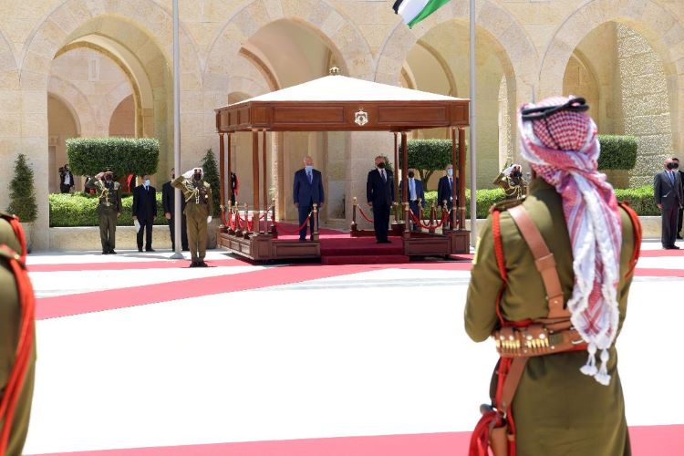 وكان في استقبال سيادته، العاهل الأردني الملك عبد الله الثاني، حيث عُزف النشيد الوطني الفلسطيني، والسلام الملكي الأردني.