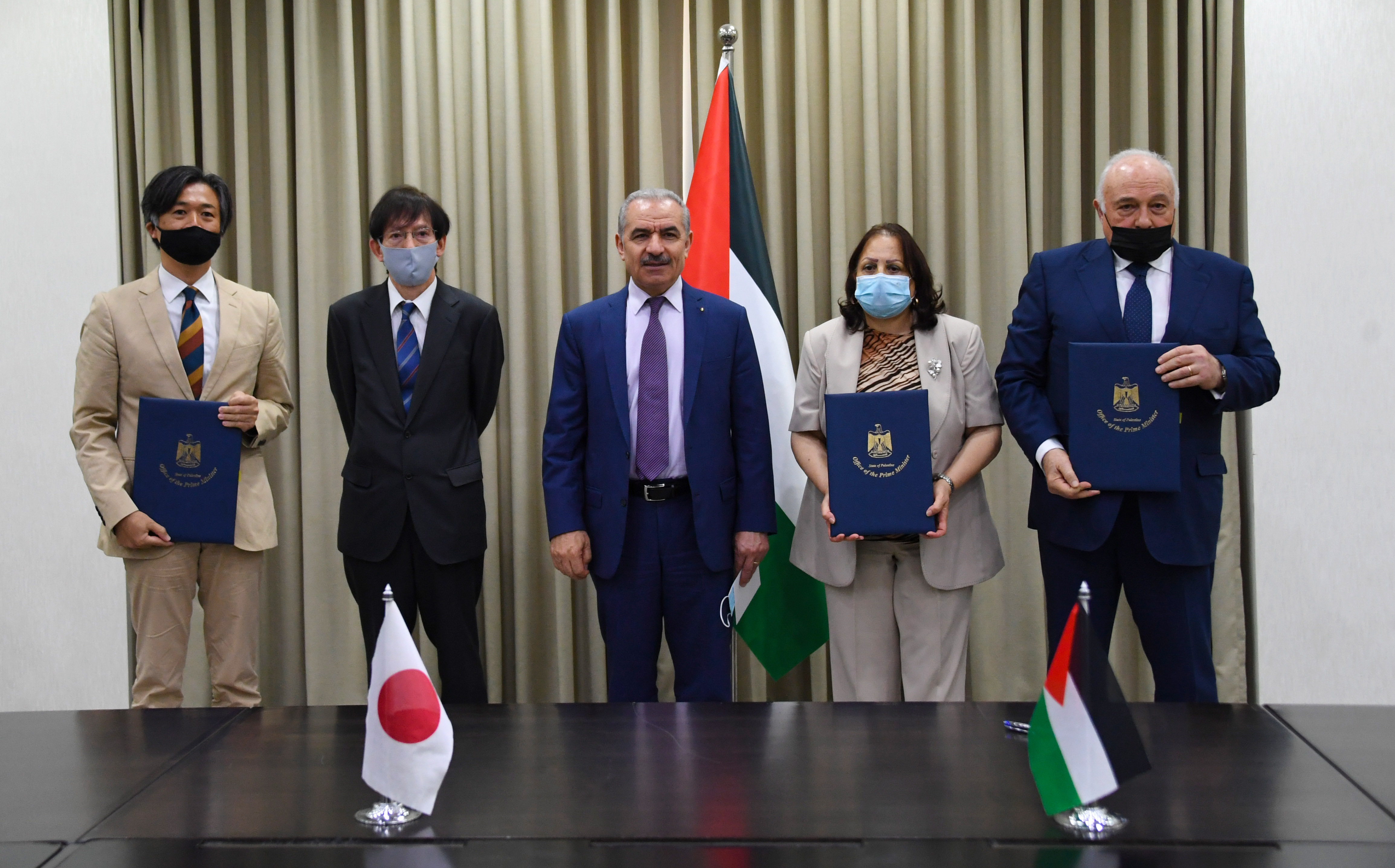 رام الله 30-6-2021 وفا- تحت رعاية وحضور رئيس الوزراء محمد اشتية وممثل اليابان لدى فلسطين ماسايوكي ماجوشي، وقع وزير المالية شكري بشارة ووزيرة الصحة مي الكيلة مع رئيس مكتب الوكالة اليابانية للتعاون الدولي "جايكا" في فلسطين توشيا آبي، منحة من الحكومة اليابانية بقيمة 8 مليون دولار لدعم جهود فلسطين في مواجهة "كورونا"، اليوم الأربعاء في مكتب رئيس الوزراء برام الله.
