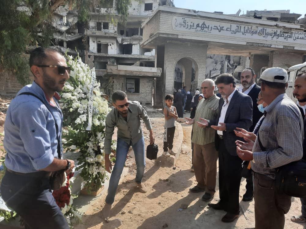 دمشق 20-7-2021 وفا- وضع مدير عام الدائرة السياسية لمنظمة التحرير السفير أنور عبد الهادي، اليوم الثلاثاء، أكاليلا من الزهور باسم رئيس دولة فلسطين محمود عباس على أضرحة الشهداء في مخيم اليرموك، وضريح سفير دولة فلسطين لدى دمشق القائد الوطني محمود الخالدي، لمناسبة عيد الأضحى المبارك، وسط حضور لأهالي الشهداء.
