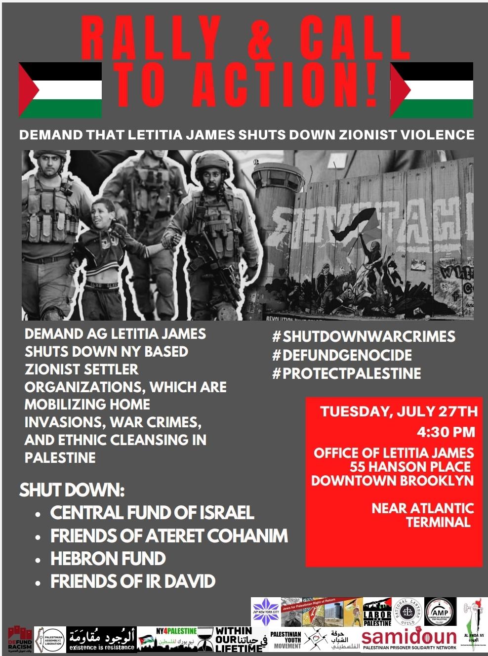 واشنطن 26-7-2021 وفا- ينظم تحالف مؤسسات أنصار الحق الفلسطيني في الولايات المتحدة الاميركية تظاهرة يوم غد الثلاثاء، امام مكتب المدعية العامة لمدينة نيويورك لاتيتا جونز، لمطالبتها بإغلاق مكاتب منظمات اميركية استيطانية، منها منظمتان تمولان وتجمعان التبرعات لحركة "عطيرات كوهانيم" وللبؤرة الاستيطانية في الخليل.