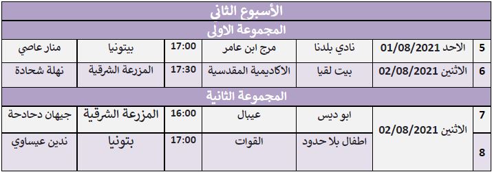 القدس 28-7-2021 وفا- أعلن الاتحاد الفلسطيني لكرة القدم، اليوم الأربعاء، جدول مباريات الأسبوع الثاني من دوري سباعيات الأندية النسوية.