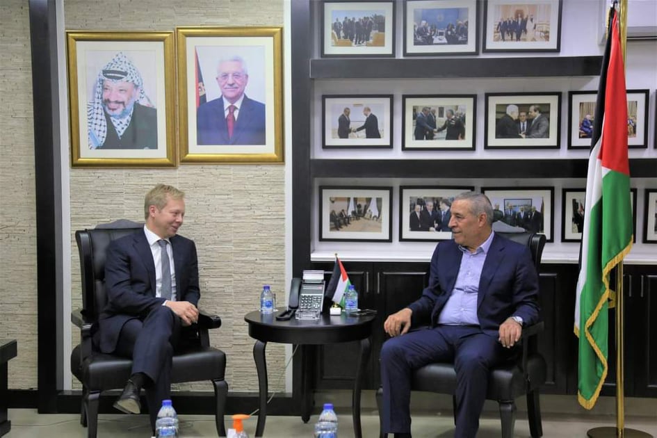 رام الله 28-7-2021 وفا- استقبل عضو اللجنة المركزية لحركة "فتح"، رئيس الهيئة العامة للشؤون المدنية الوزير حسين الشيخ، في مكتبه بمدينة رام الله، اليوم الأربعاء، المبعوث الأوروبي لعملية السلام في الشرق الأوسط سفين كوبمانز، والوفد المرافق له.