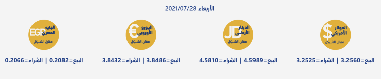 رام الله 28-7-2021 وفا- جاءت أسعار العملات مقابل الشيقل الإسرائيلي، اليوم الأربعاء، حسب سلطة النقد، على النحو التالي: