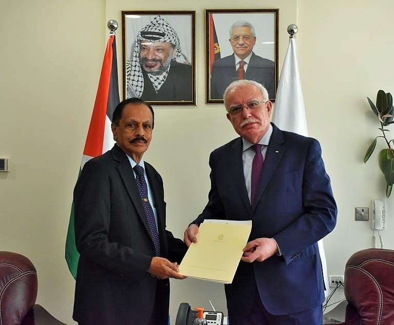رام الله 3-8-2021 وفا- تسلم وزير الخارجية والمغتربين رياض المالكي، اليوم الثلاثاء، في مقر الوزارة بمدينة رام الله، نسخة من أوراق اعتماد سفير جمهورية سريلانكا الديمقراطية الاشتراكية الجديد لدى دولة فلسطين نوالاج بنت كوري.
