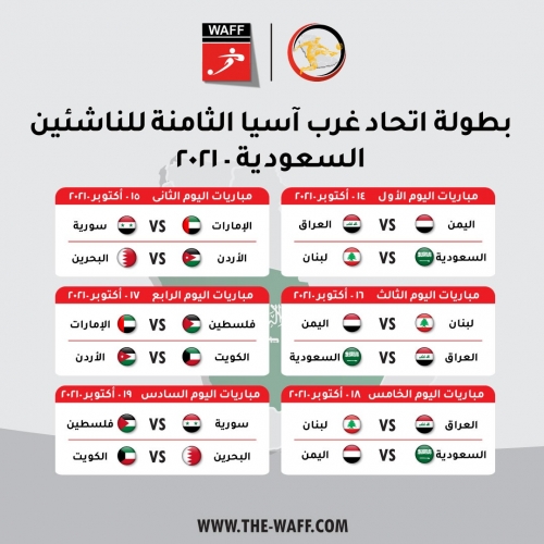 عمّان 12-9-2021 وفا- وقع منتخبنا الوطني للناشئين إلى جانب منتخبات سوريا والإمارات ضمن المجموعة الثانية في بطولة اتحاد غرب آسيا الثامنة للناشئين (مواليد 2006 فما فوق) والمقرر إقامتها في السعودية.